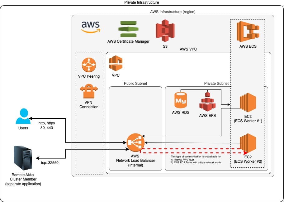 We deployed an AWS ECS Cluster using Terraform, with multiple application components communicating via AWS Network Load Balancer (NLB). The NLB was chosen because the application used a custom protocol (AKKA Cluster Discovery Protocol over TCP), which AWS ALB does not support.